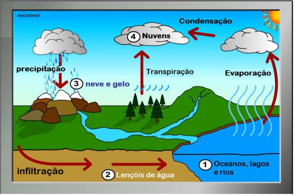 A água é um recurso natural renovável, pois a água evaporada fica armazenada nas nuvens, e quando chove, volta na forma líquida para sua origem, o solo. Como podes ver na imagem seguinte: